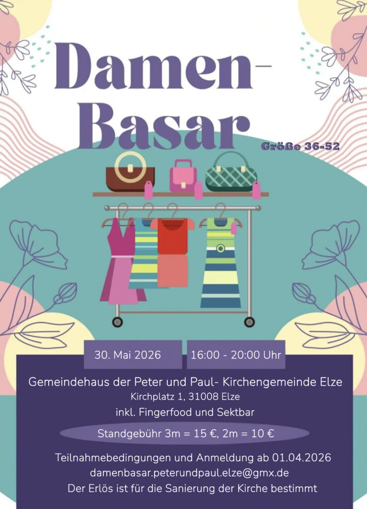 Auf vielfachen Wunsch findet am Samstag, 30.05.2026 der 1. Damenbasar im Gemeindehaus der Peter und Paul-Kirche in Elze statt.