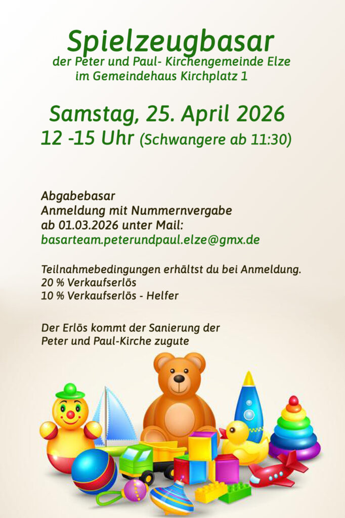 Am Samstag, 25.04.2026 findet der 3. Spielzeug Basar im Gemeindehaus der Peter und Paul-Kirche in Elze statt.